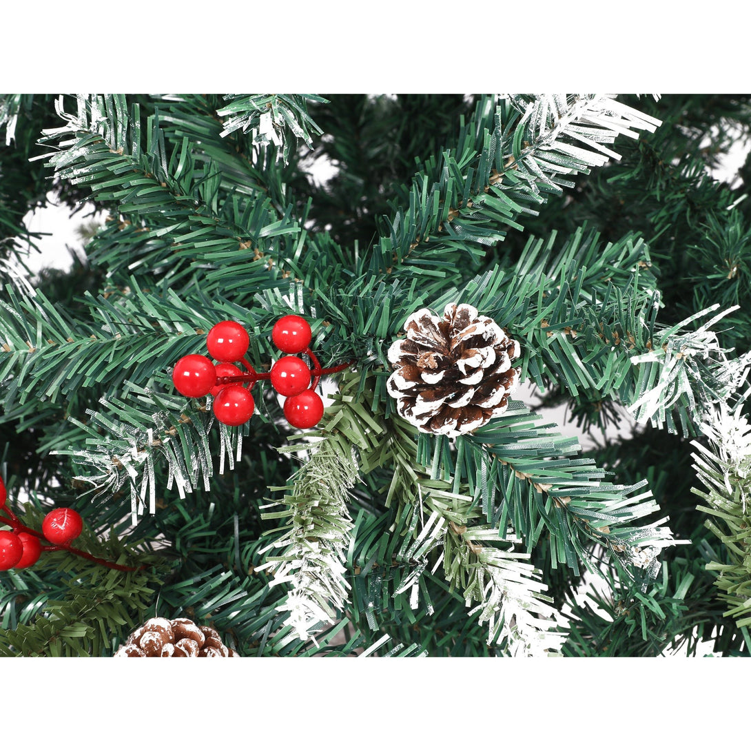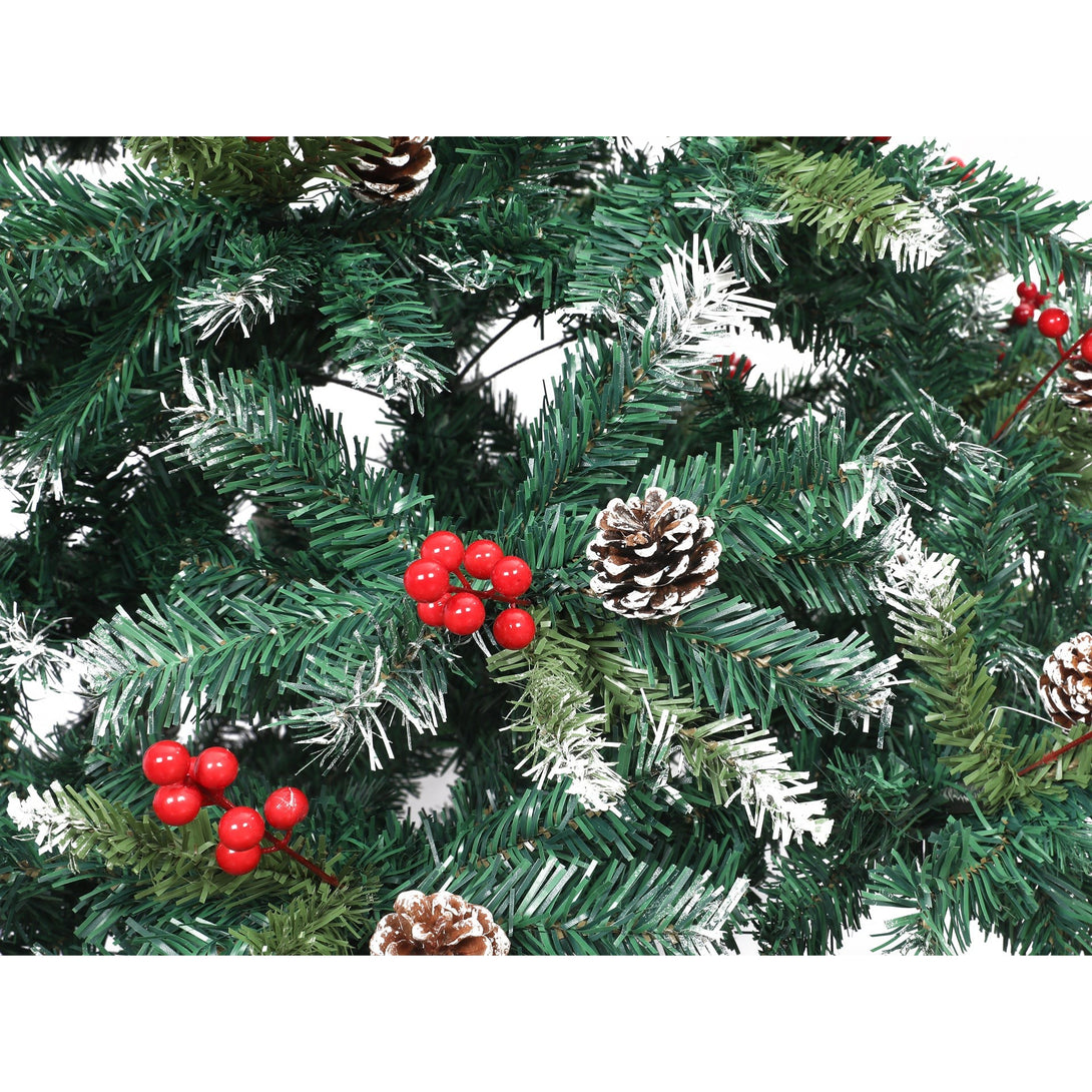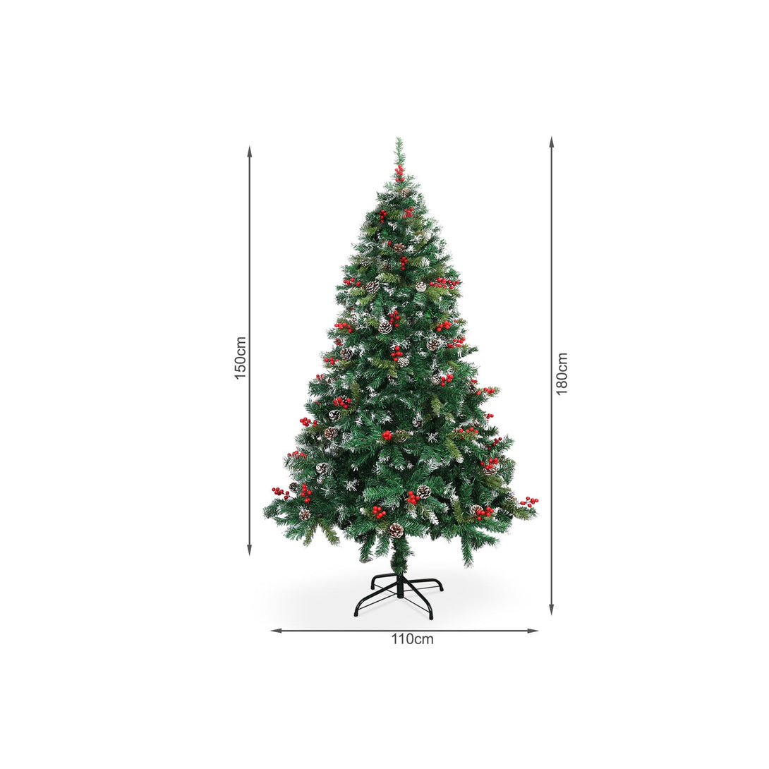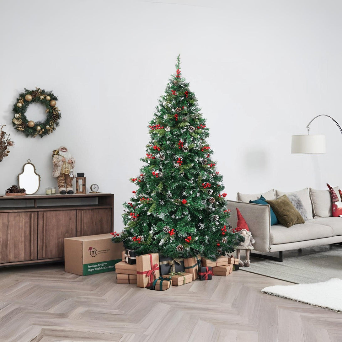 This beautiful tree comes adorned with charming red holly berries and pine cone decorations, adding a touch of traditional charm to your home. With its thick foliage and artificial snow-tipped branches, it creates a magical atmosphere that captures the spirit of the holiday season.