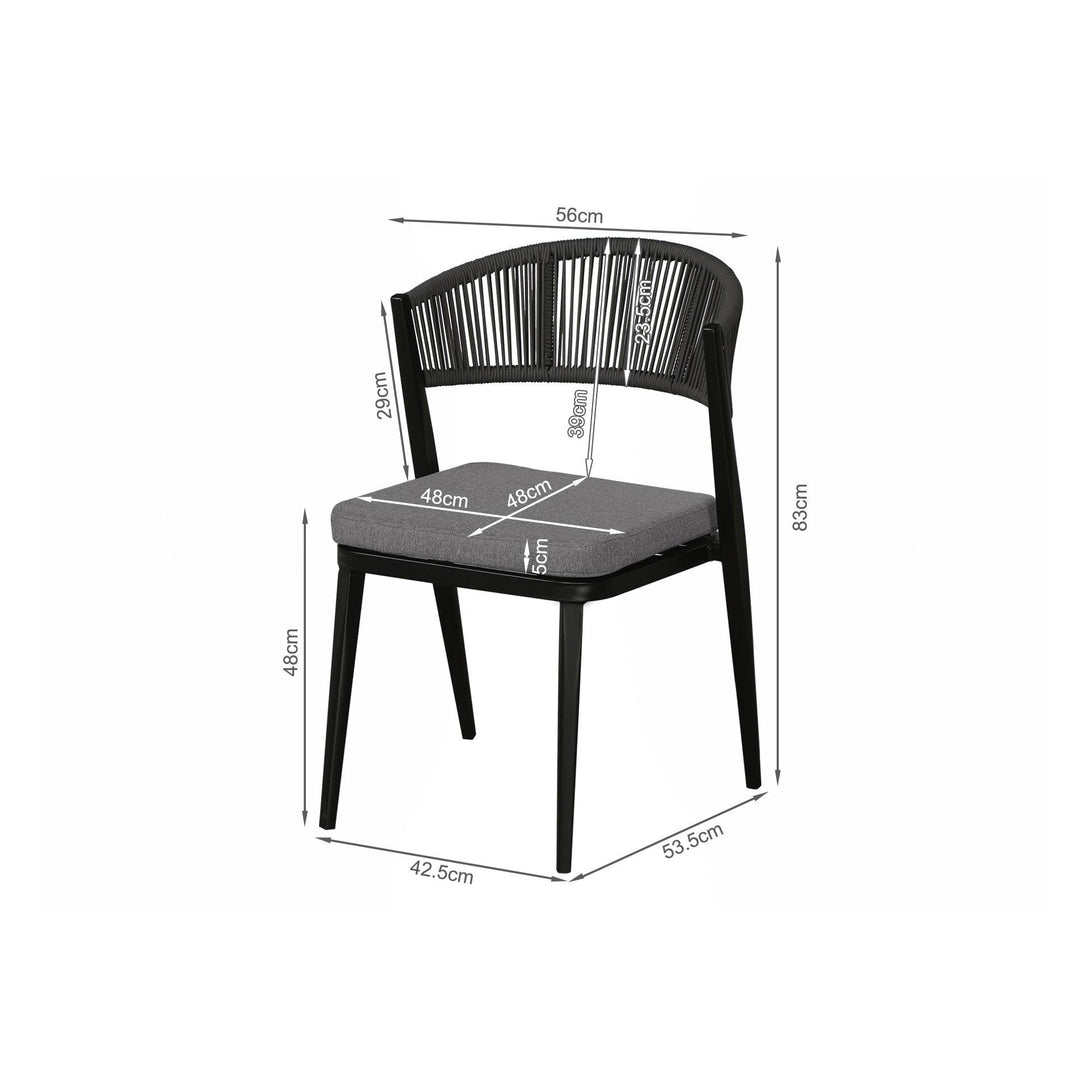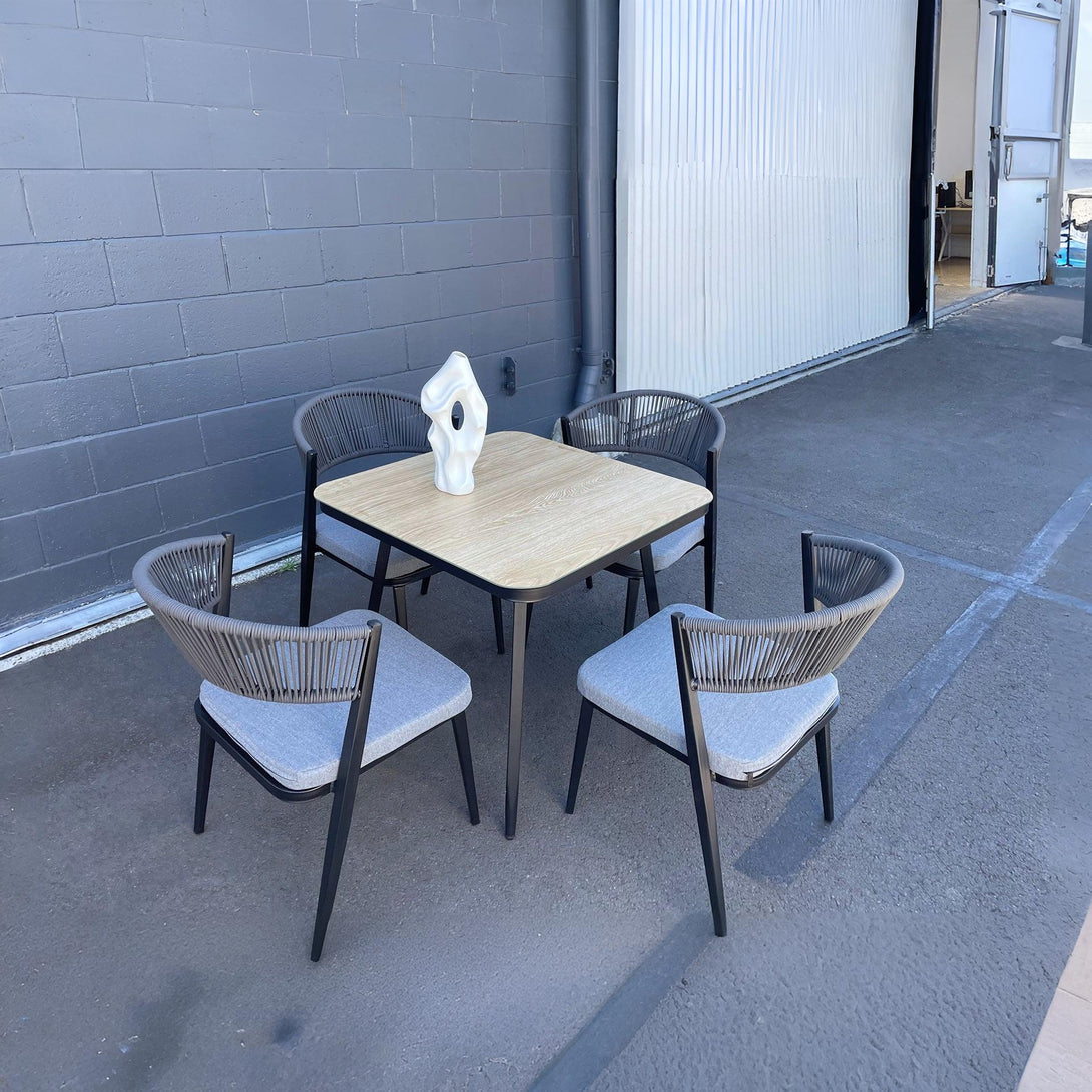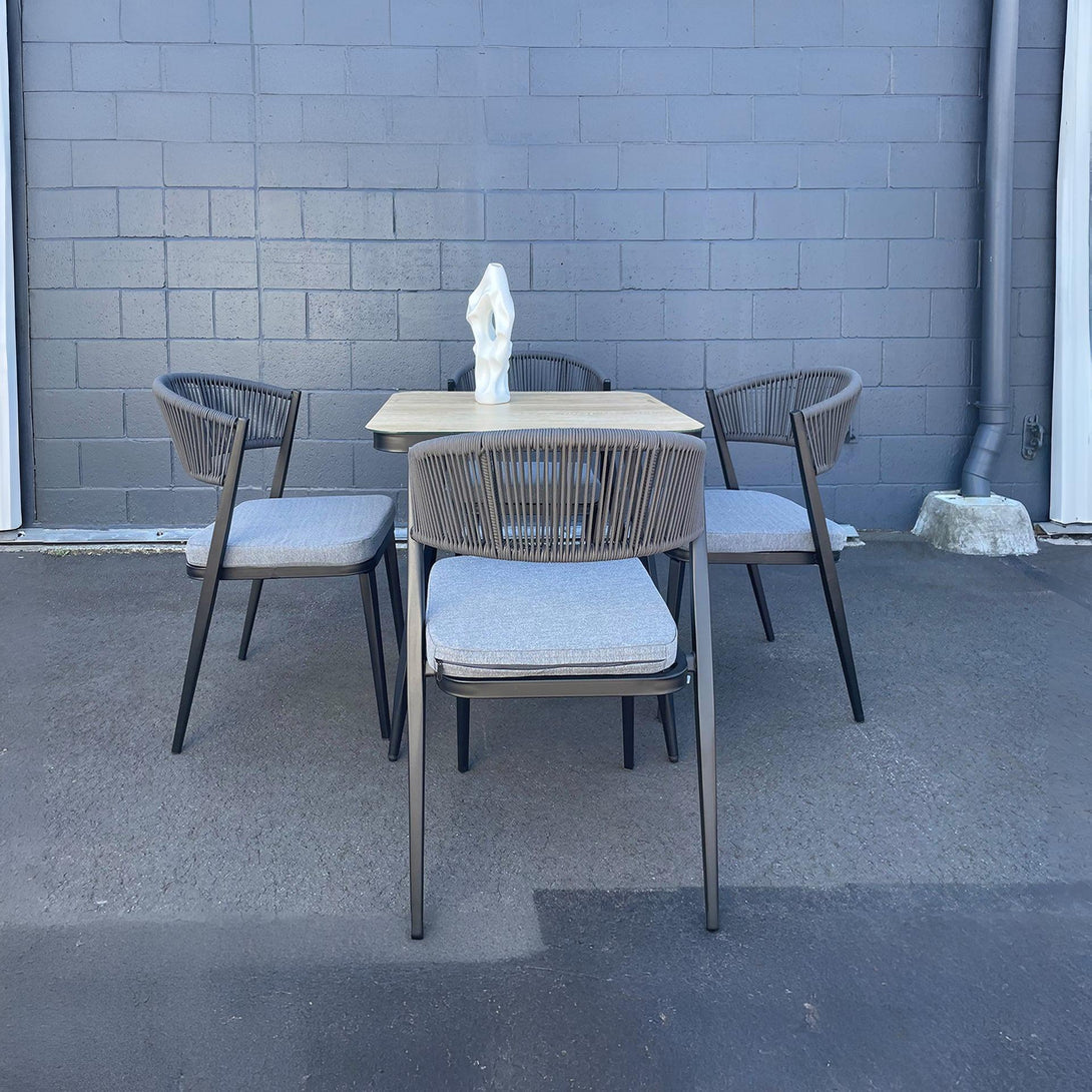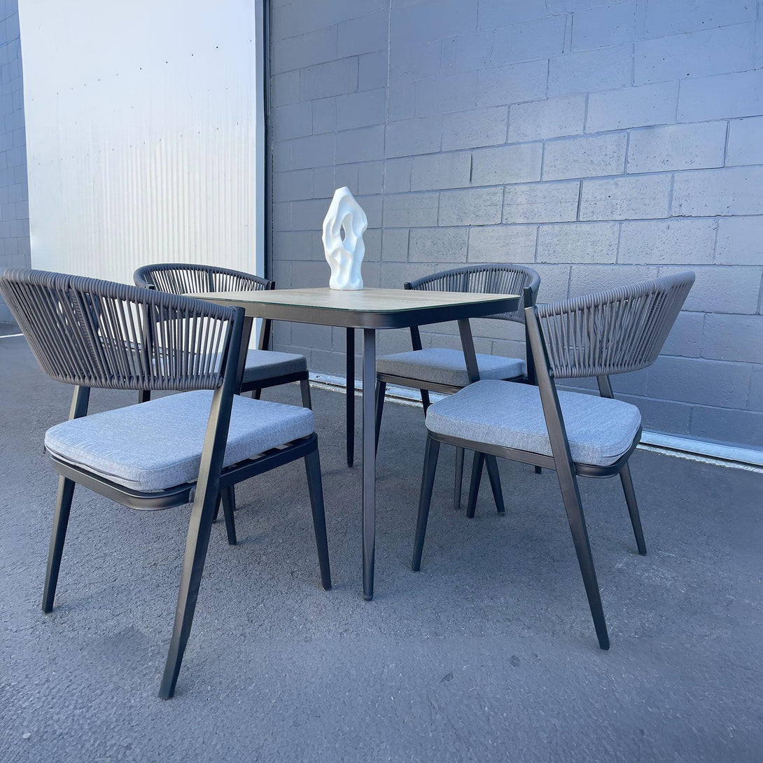 A perfect combination of sleek grey metal frames for support and intricately woven rope highlights, the Caldey 5 Piece outdoor dining set is designed to be the oasis around which everyone will gather. The design is modern, making it a tasteful addition to any garden or patio, and the table top is made of tempered glass giving a classier, more durable look and finish.