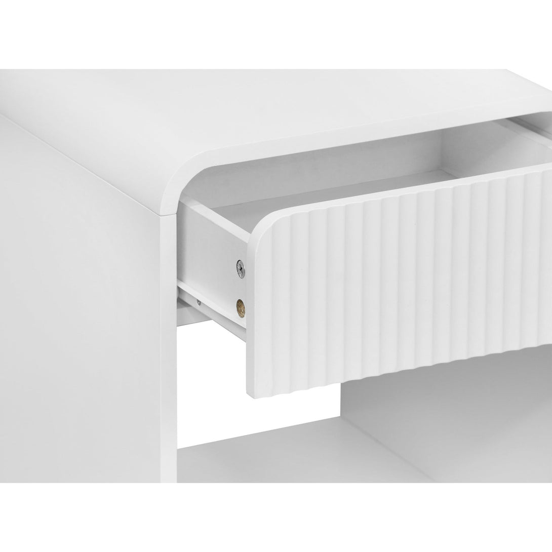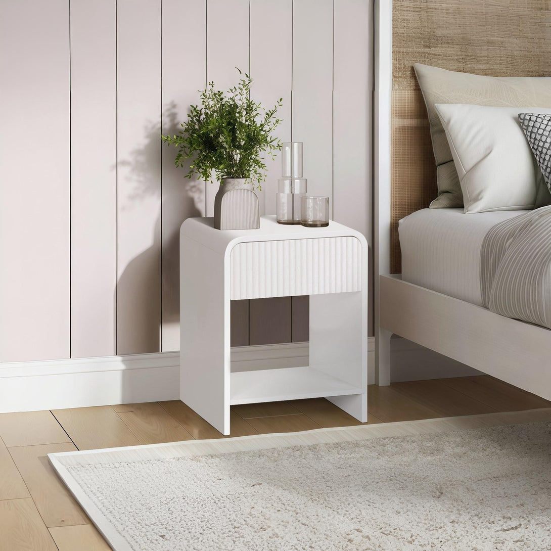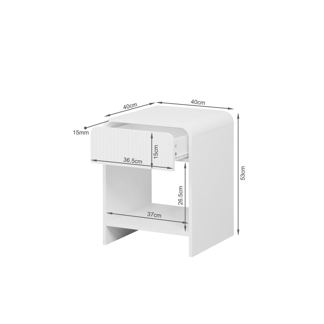 Elevate your bedroom with this Cannock Bedside Table, featuring a striking fluted drawer front and a smooth matte finish. Crafted from durable MDF board, it ensures long-term stability. The open shelf offers easy-access storage, while the handle-free drawer maintains a clean, seamless look.
