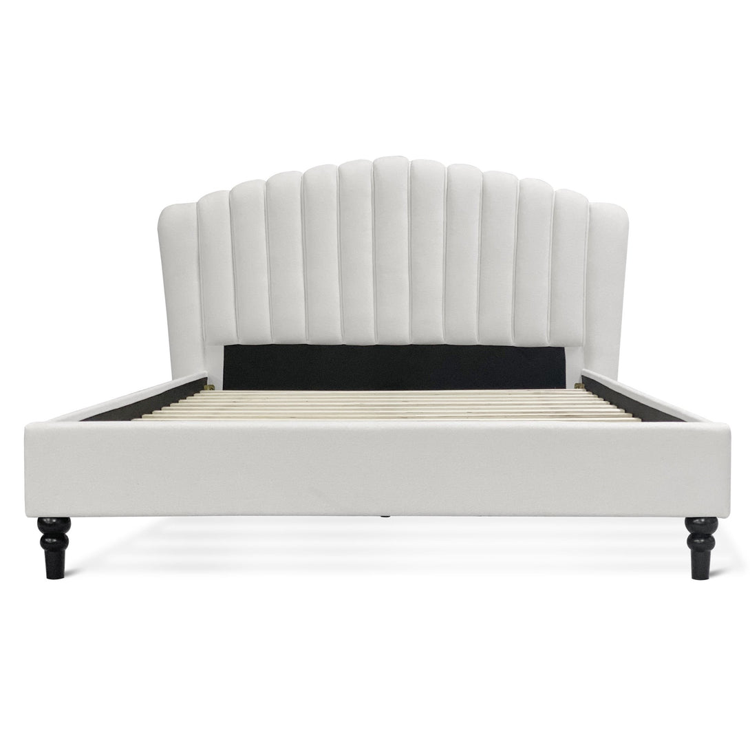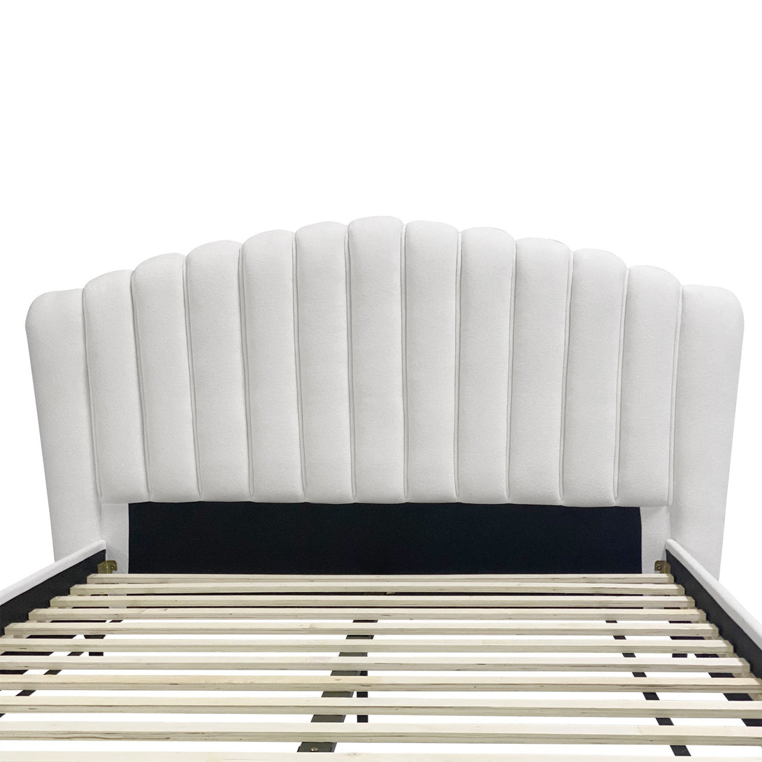 Furthermore, its striking headboard with lined detailing adds a modern touch. The wide, shell-shaped design not only introduces unique elegance but also serves as a comfortable support for relaxation or reading. Upholstered in soft polyester fabric, this bed melds comfort with style, offering a gentle touch.