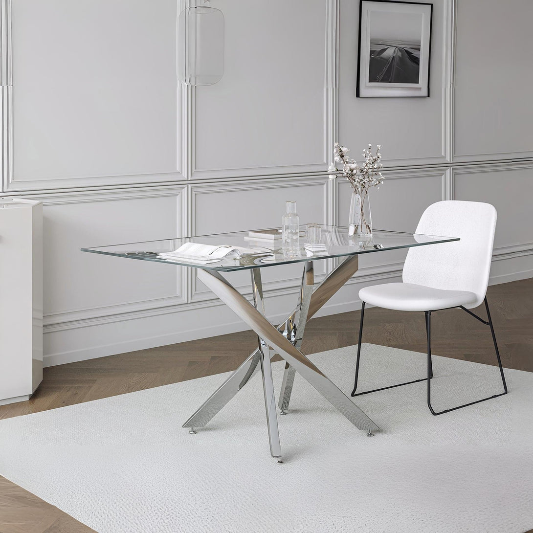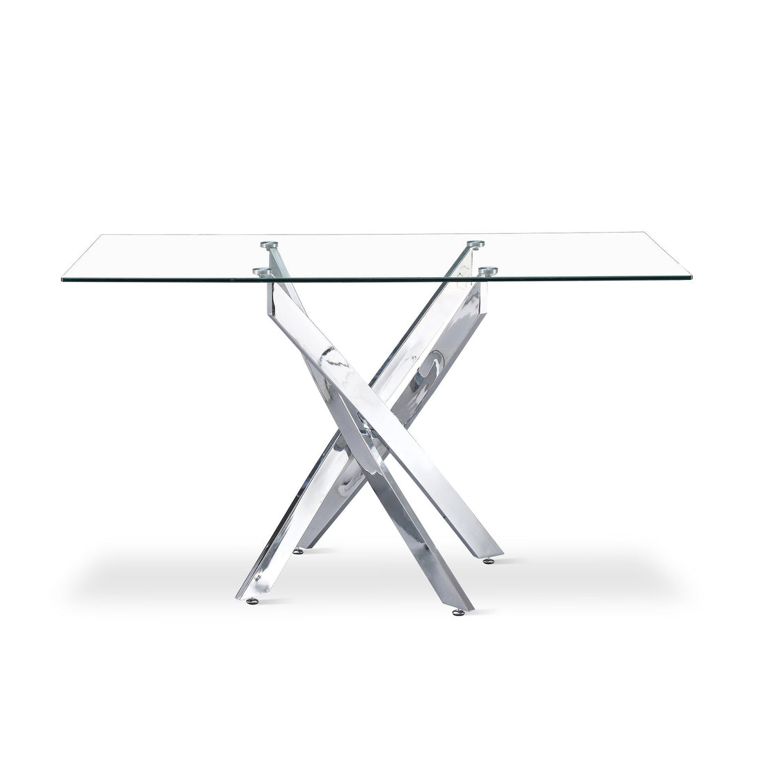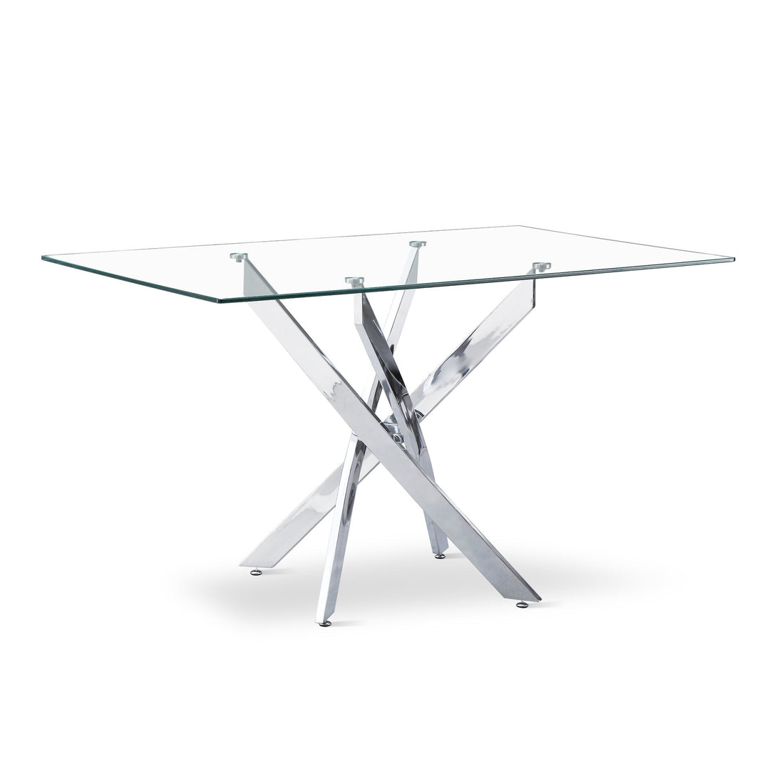 The Ember Rectangle Dining Table presents a tempered glass top with an exquisite chrome plated silver leg frame. The transparent surface harmonizes effortlessly incorporating a well integrated openness element to your dining room and any modern or contemporary interior.