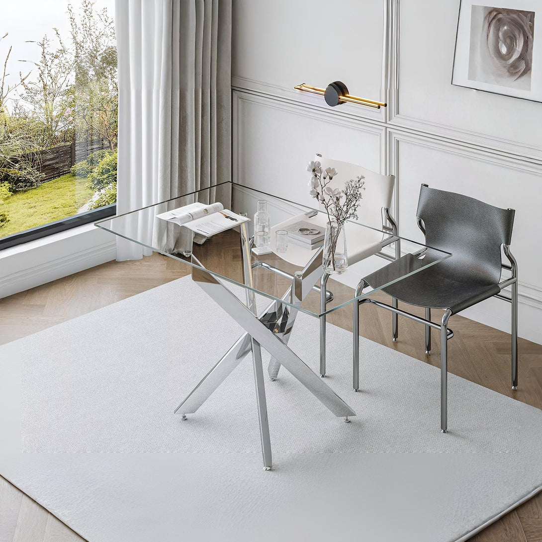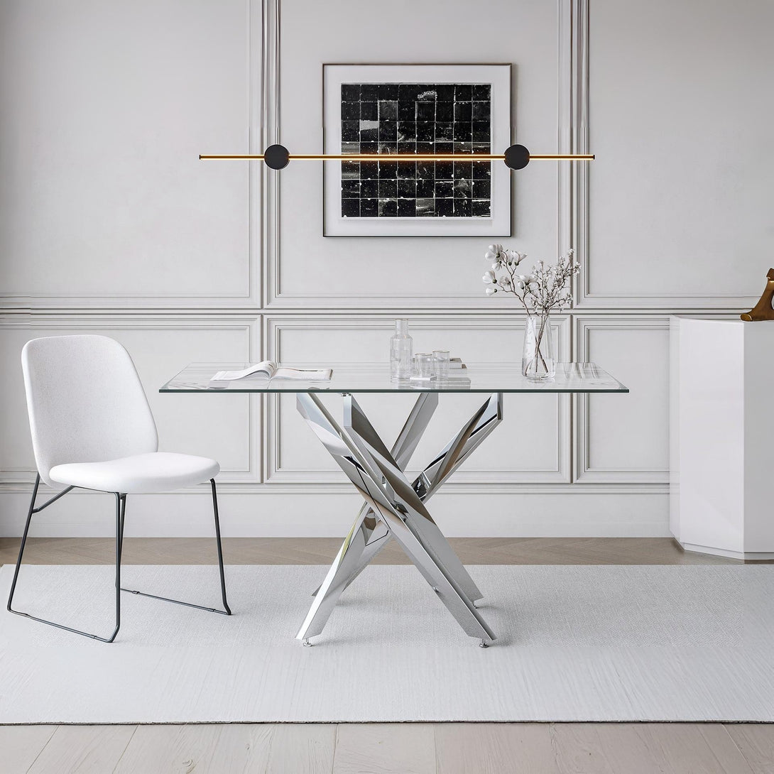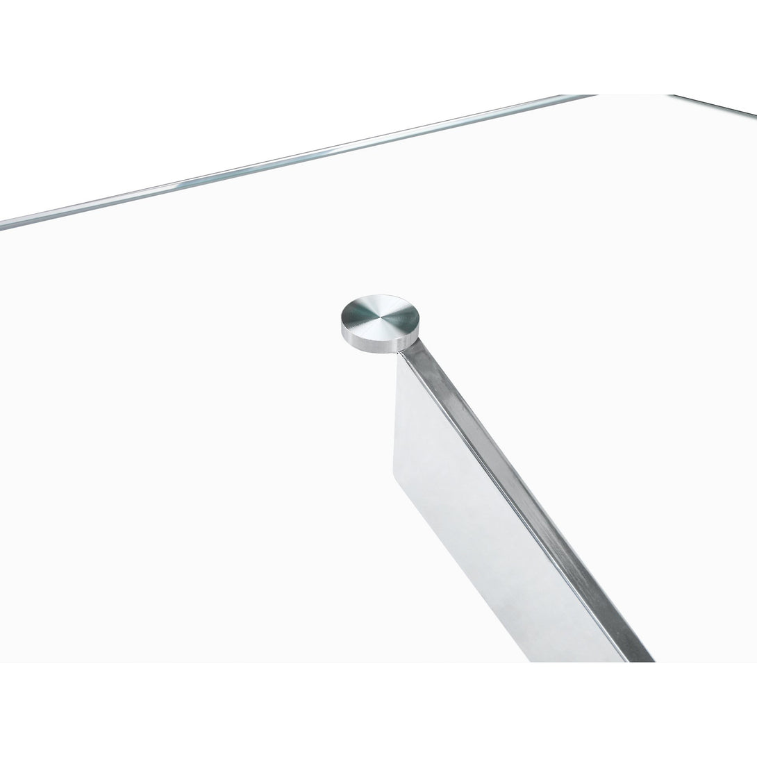 The Ember Rectangle Dining Table presents a tempered glass top with an exquisite chrome plated silver leg frame. The transparent surface harmonizes effortlessly incorporating a well integrated openness element to your dining room and any modern or contemporary interior.
