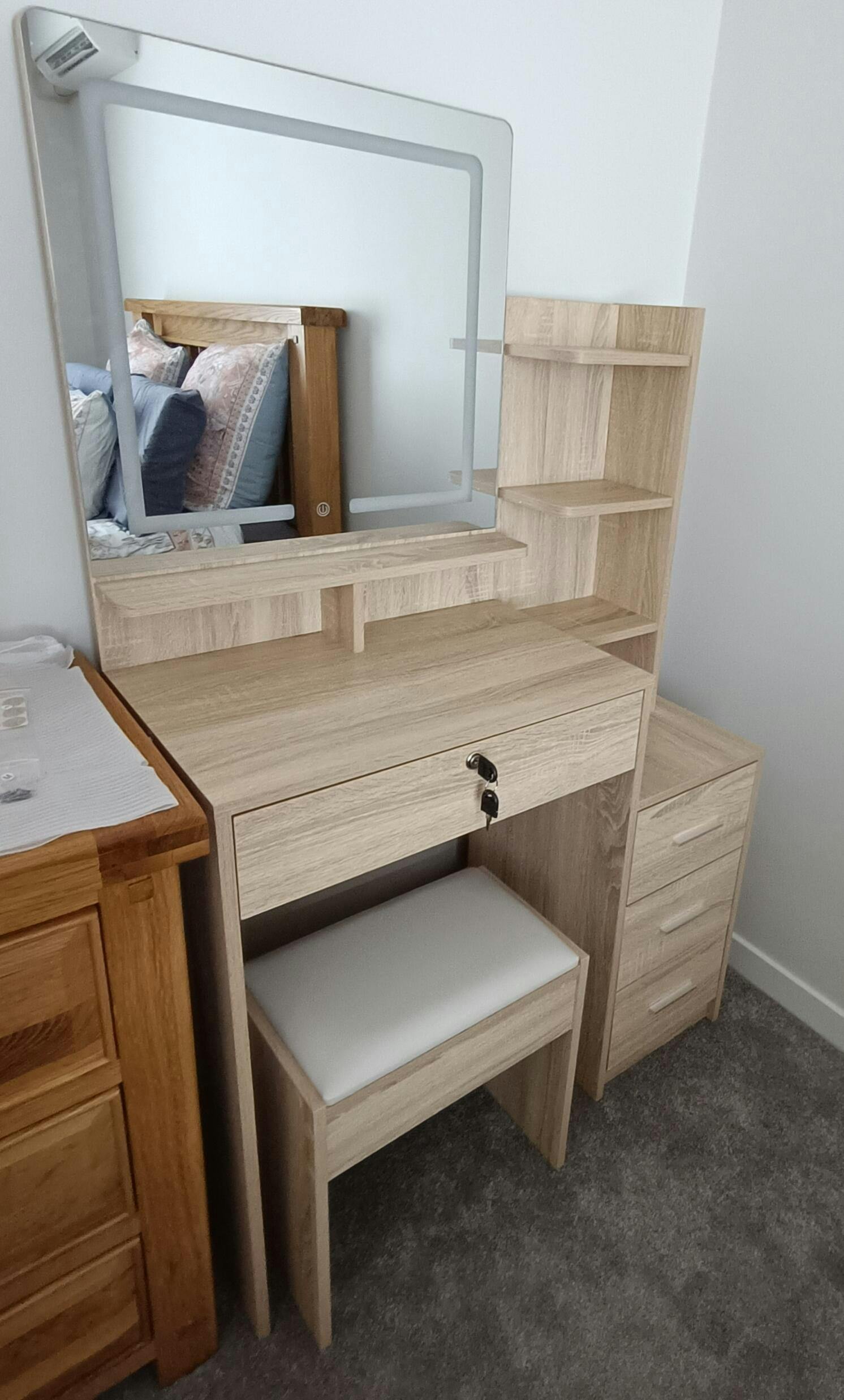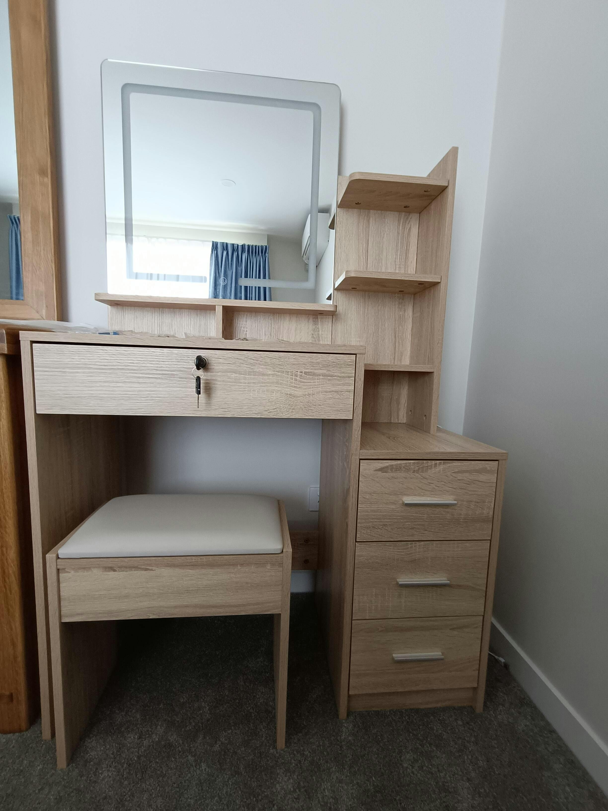 Start your day with elegance and functionality using the GARDENIA Dressing Table Set. Designed to simplify your daily routine, this 2-piece vanity set features a spacious tabletop, single drawer for essential storage, and a large LED-lit mirror that provides optimal visibility. The matching stool with cushioned seating ensures comfortable use, while the clean oak finish blends beautifully with a variety of bedroom décor styles.