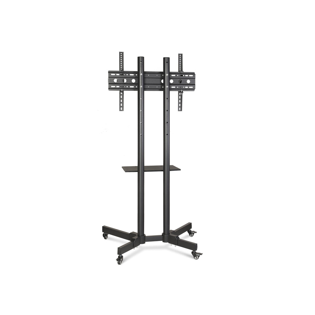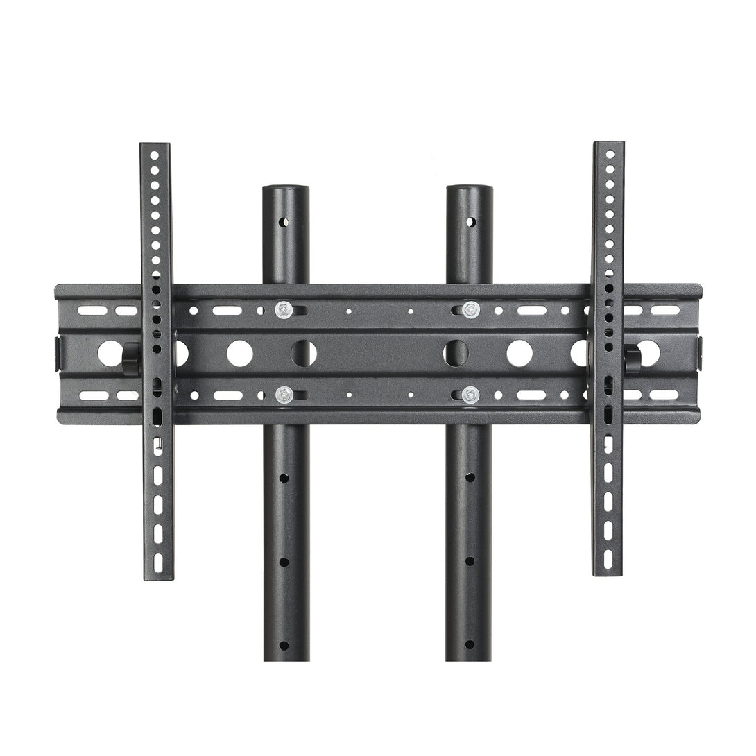 It would allow you to hold meetings with A/V support or simply to display information for your employees or clients. All parts of the TV stand are made of heavy duty steel to guarantee its security and stability. Solid black steel material ensures TV stand to be used for a long time. 4 smooth wheels lockable design allows you to move it anywhere and keep it stationary in working, also protect the floor from scratches. It is much better than putting holes in the wall, save your time and energy! The two vertical rods, height and angle adjustment design would suit your needs and improve your viewing experience! What’s more, under the TV stand bracket, there is a lower shelf for you to place your laptop, remote controller or your favorite DVDs, etc. Therefore, it is a great choice for video conferences or presentations with our TV stand in trade shows and business.