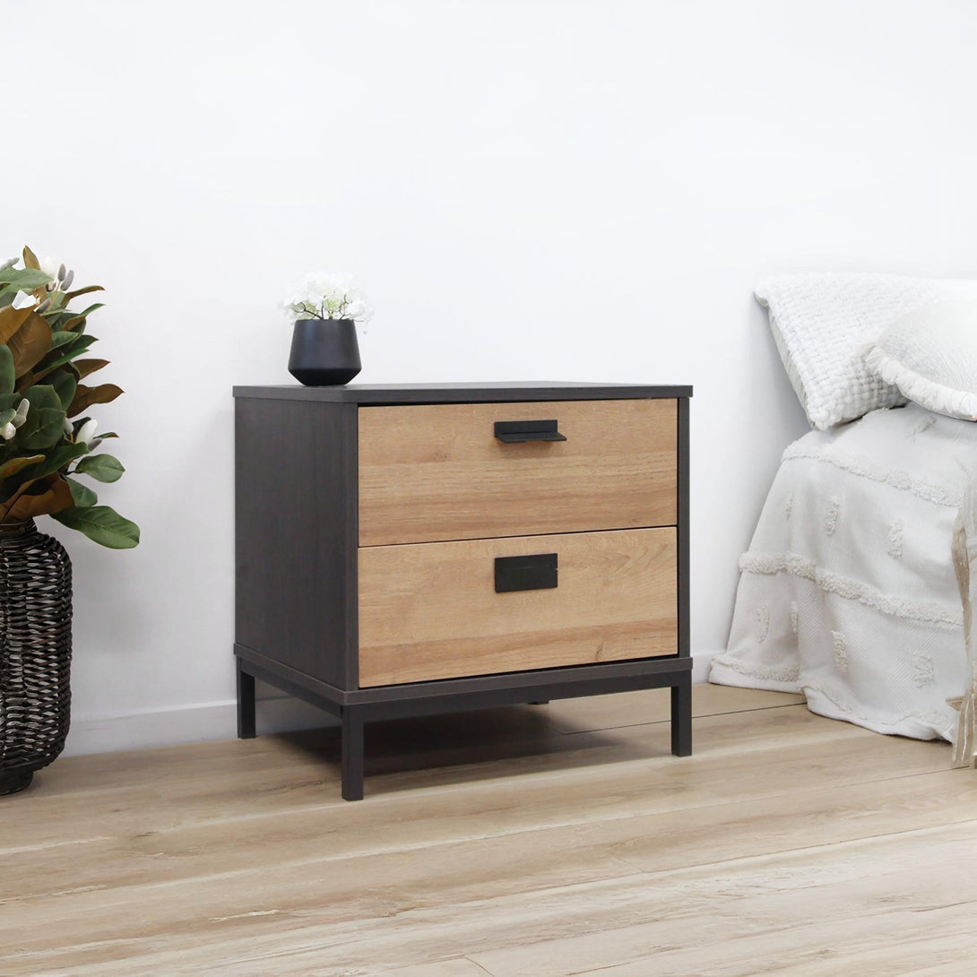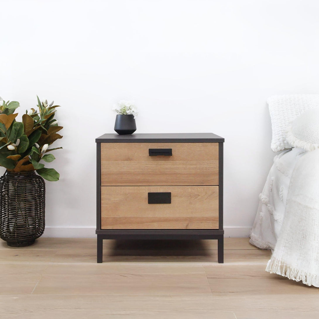 This MORRIS Bedside Table is one of our MORRIS range products with an elegant and chic style that will add the beauty of form and function to your home. Made of sturdy wood, this bedside table is sturdy and durable for long time use; while the metal legs provide unwavering support for this bedside table. Its 2 drawers provide ample storage space for storing bedtime essentials and the table top offer enough space for your daily supplies. The black handles add a chic and timeless feel to your bedroom.