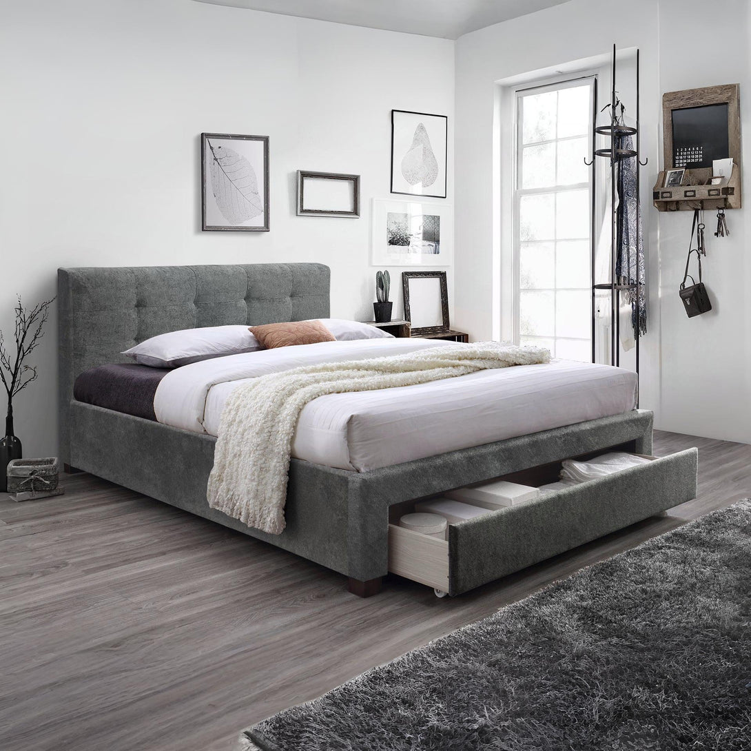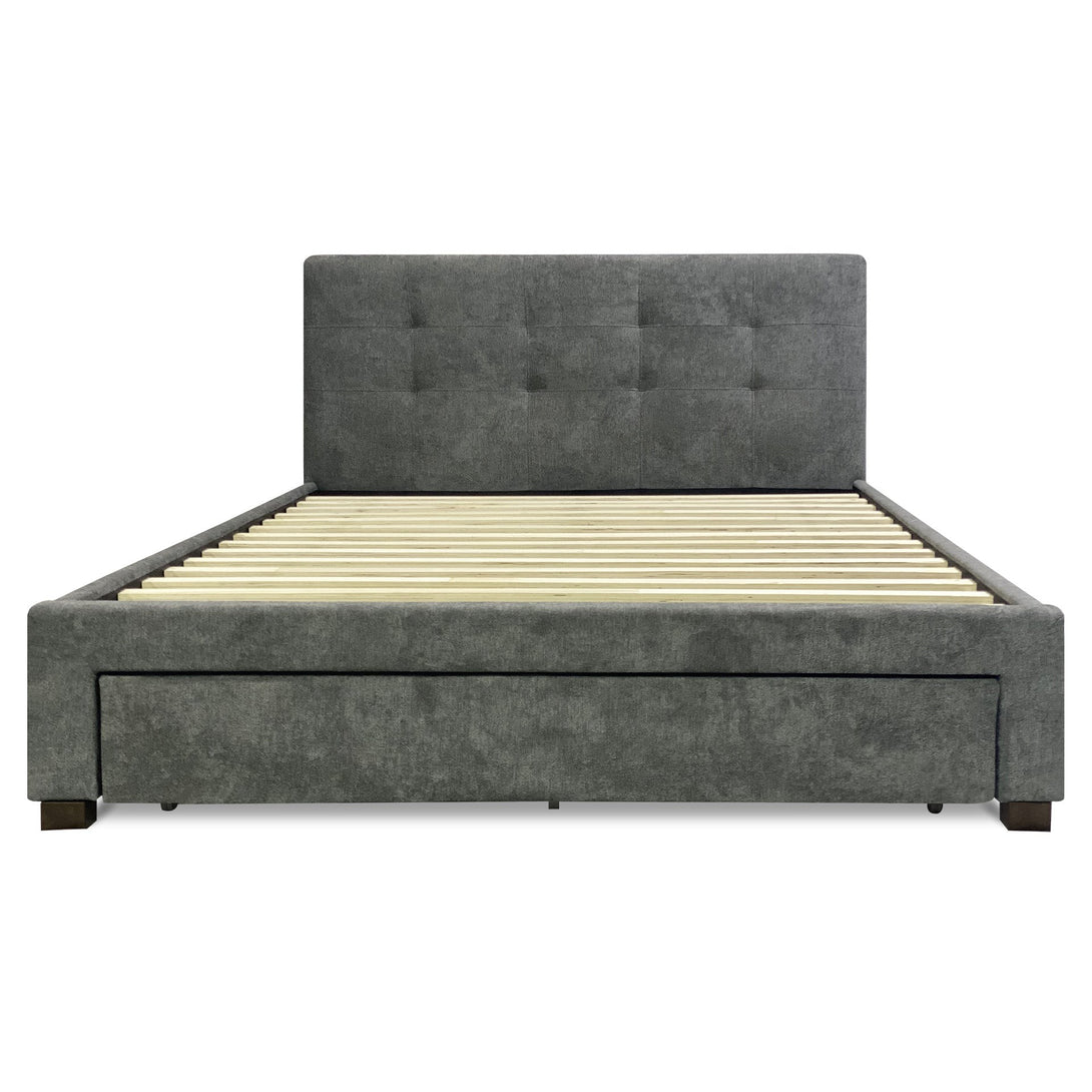 The bed frame's standout feature is its spacious sliding storage drawer positioned at the end. This design not only provides added convenience but also maximizes spatial efficiency, ensuring your room remains neat and organised. Constructed with sturdy wooden flat slats and bolstered by robust metal beams and struts, it offers exceptional support and offers a great foundation for your mattress to make your nights comfortable. Its wooden legs lend an added layer of elegance to the structure. The headboard, upholstered in a neutral grey tone, boasts square tufting for added texture and is generously filled with high-density foam, ensuring optimal comfort.