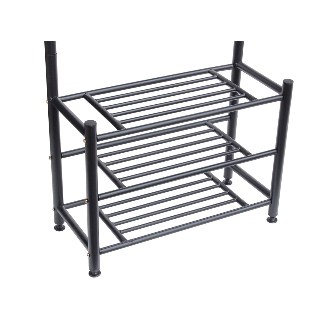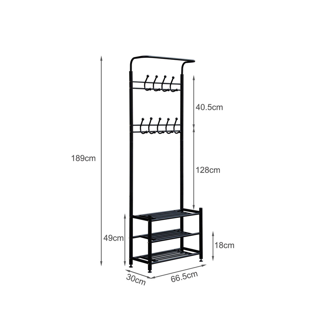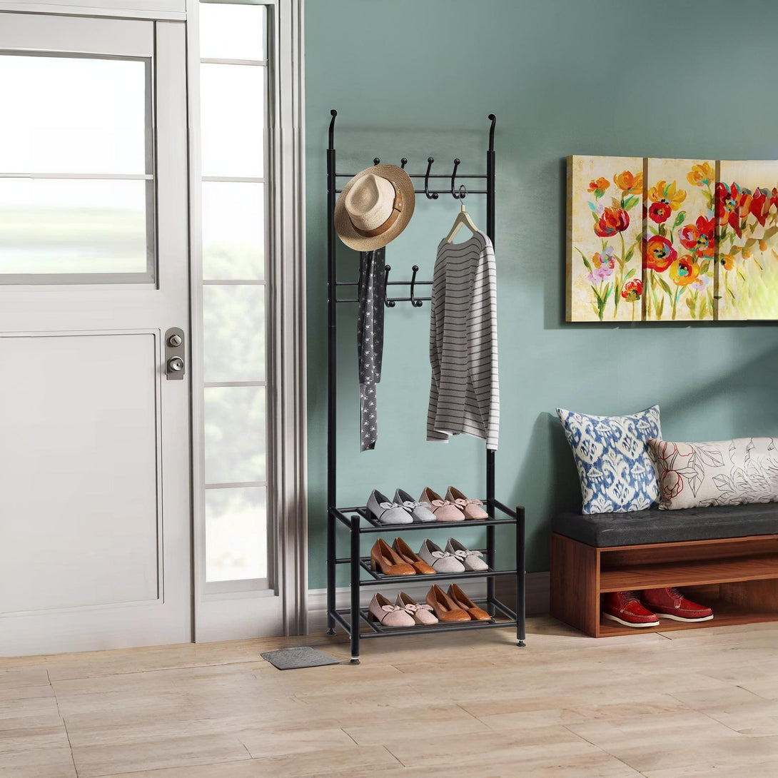 This durable and fashionable coat rack features 3-tier shoe rack for storing shoes and 18 hooks for hanging coats, jackets, handbags, purses, scarves, umbrellas, book bags, and what not. You can easily store extra clothes and accessories and keep your pants and shirts organized and separated on this Coat Stand Hanger.