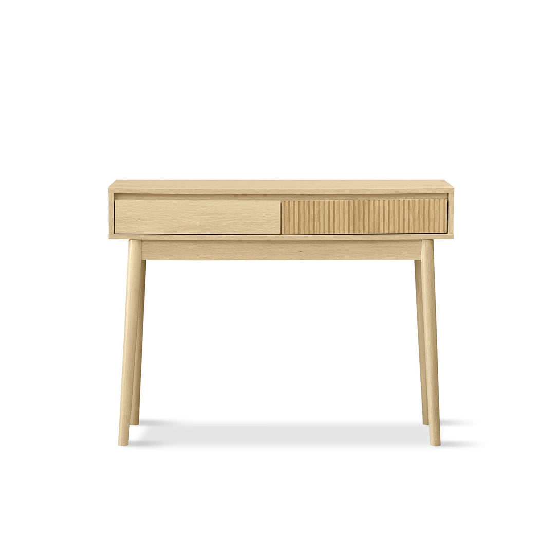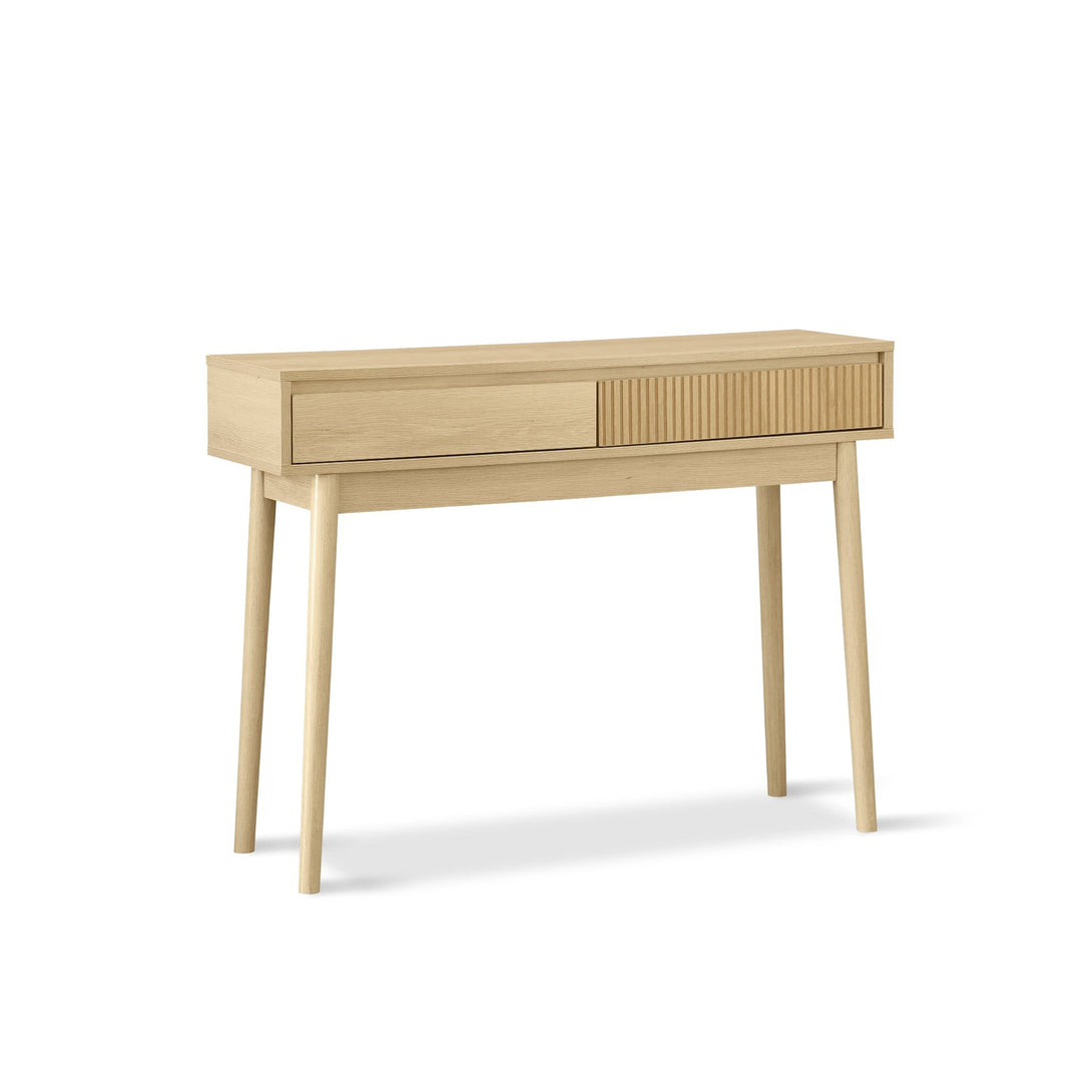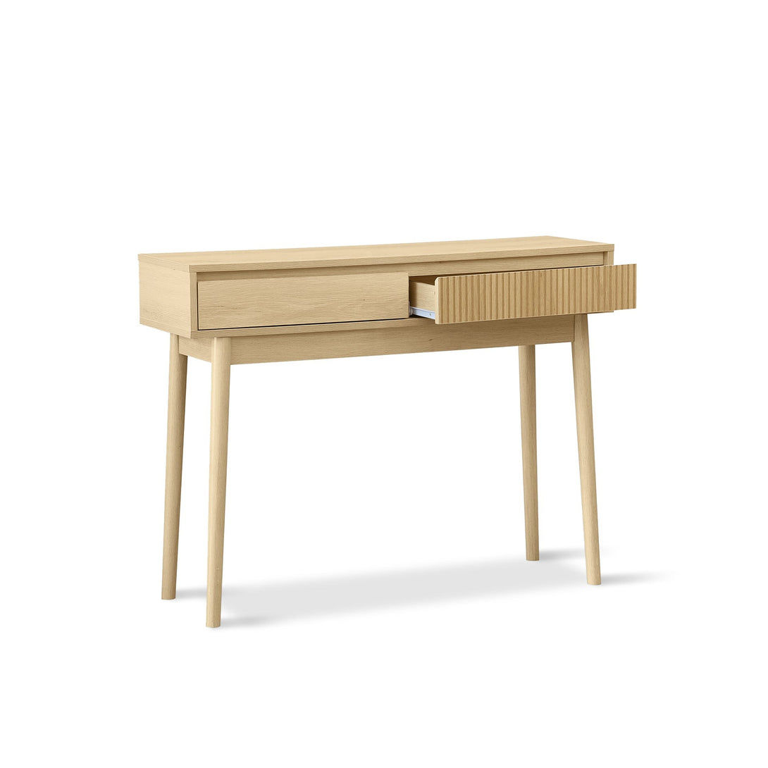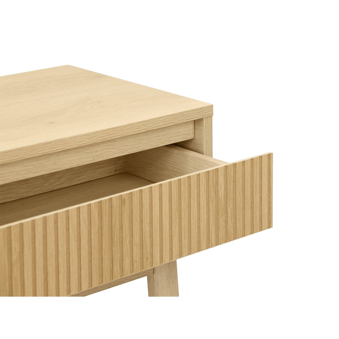 A pair of drawers with elegant slant-grip fronts uniting form with function. The linear MDF panelling with oak melamine finish adds texture and highlight.
