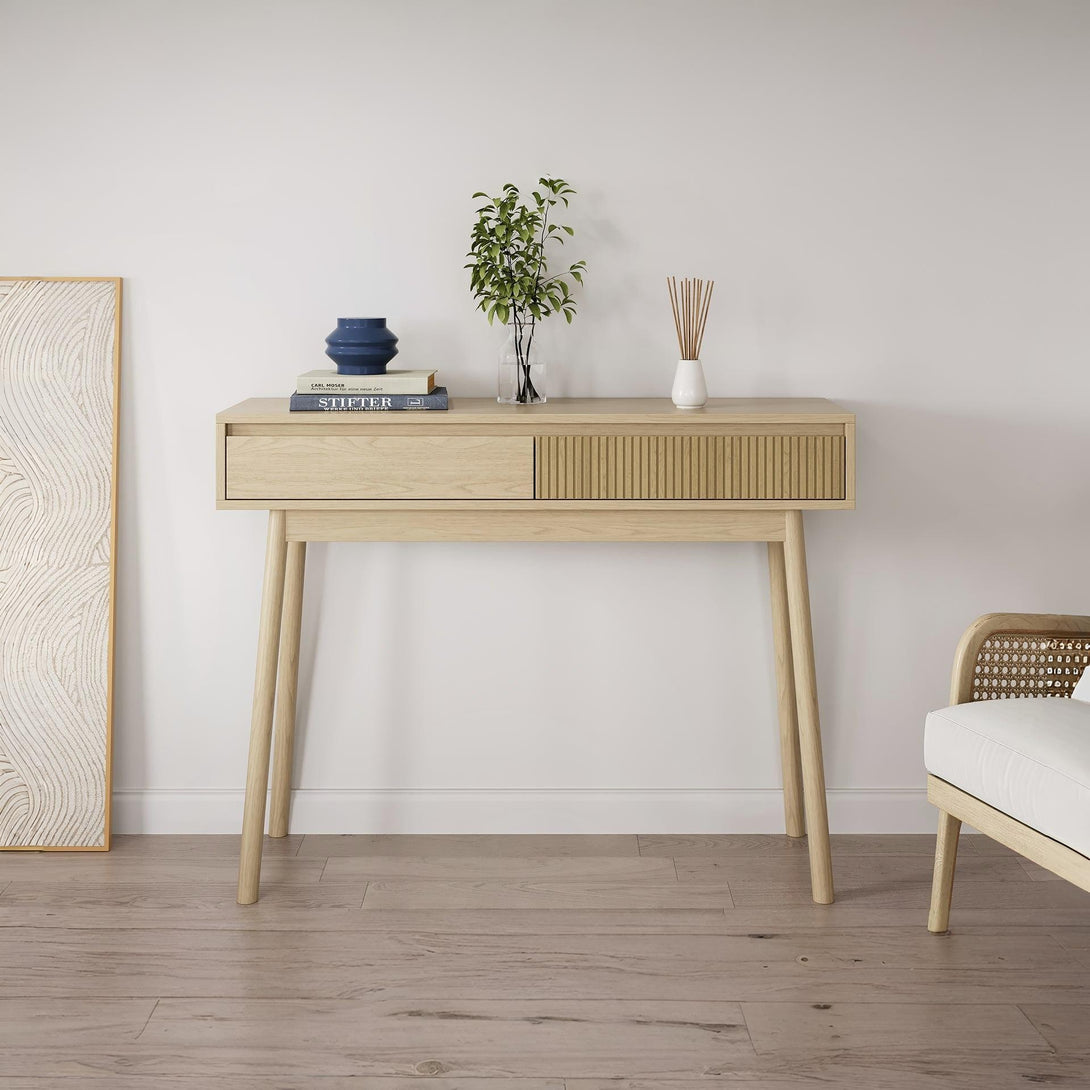 Made from eco-friendly materials with wood-look paper laminate finish, this console table easily fits your space. Console table can be used as a console table, entryway table or study table.