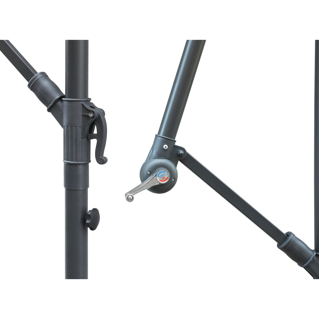Crafted from PA coating waterproof and UV-resistant 180gsm polyester fabric, this Outdoor Cantilever Umbrella is built to withstand the elements and keep you dry during unexpected showers. Its durable and sturdy construction features a steel frame and cross base, ensuring stability and longevity. The 8 steel umbrella ribs provide added support and strength.