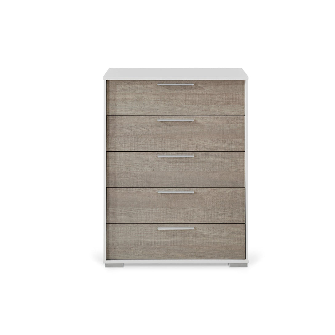This WAIPOUA 5 Drawers Tallboy is one of our WAIPOUA range products with the welcoming simplicity of modern design that will create a haven in the bedroom. This tallboy is made of sturdy wood which provides a sturdy construction that can last for years; while the silver legs provide unwavering support for this tallboy. Its 5 drawers will solve all your bedroom storage problems too as you can put different types of items in its spacious sliding drawers and keep them hidden in plain sight. The sliver handles add a chic and modern feel to your bedroom.