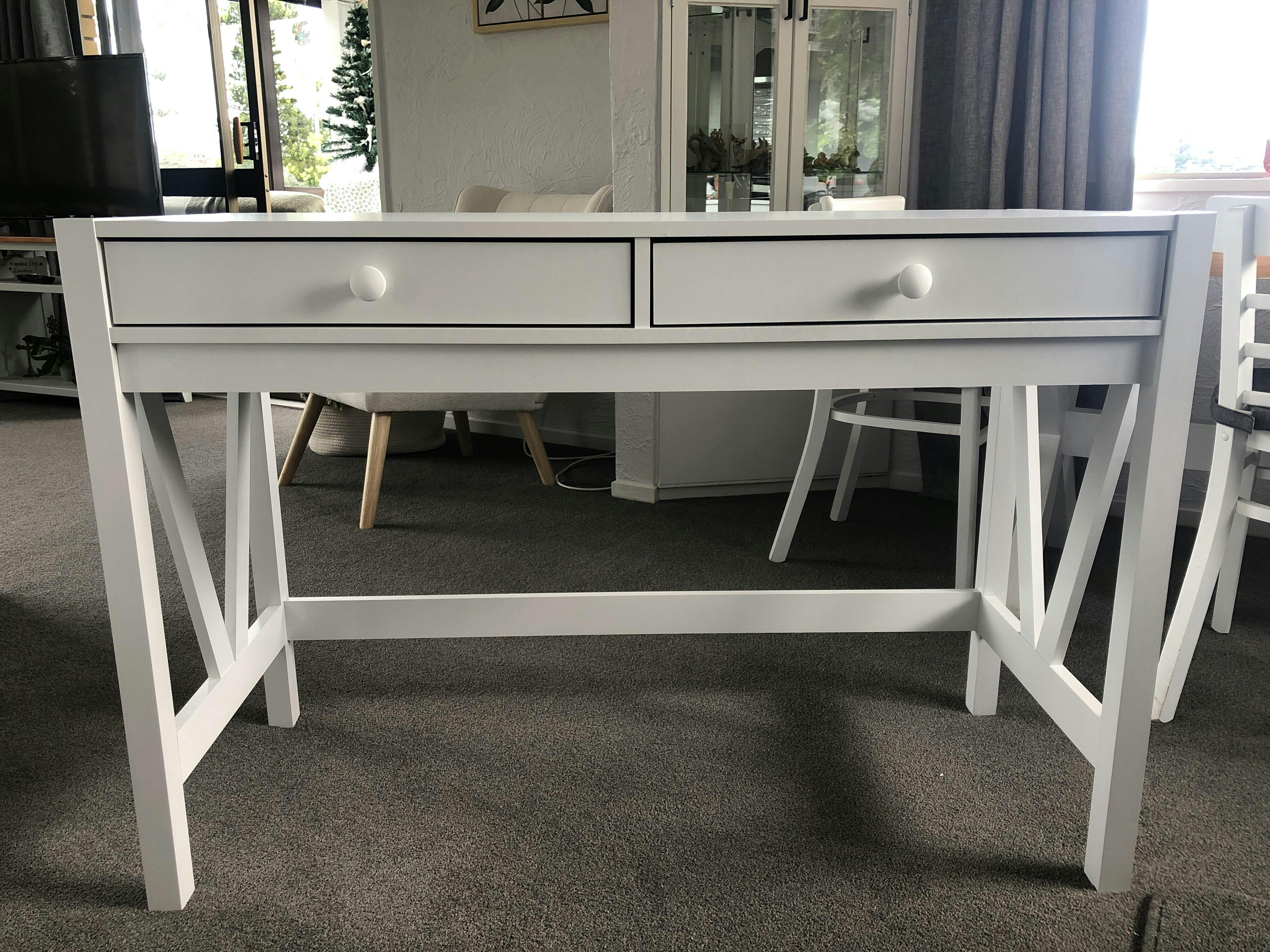 The table is designed for long-lasting durability using smooth white paper laminated particle board. Two roomy drawers with adorable round knobs offer plenty of storage for the essentials, and the extra-wide tabletop is ideal for decorative objects, books, or work materials.