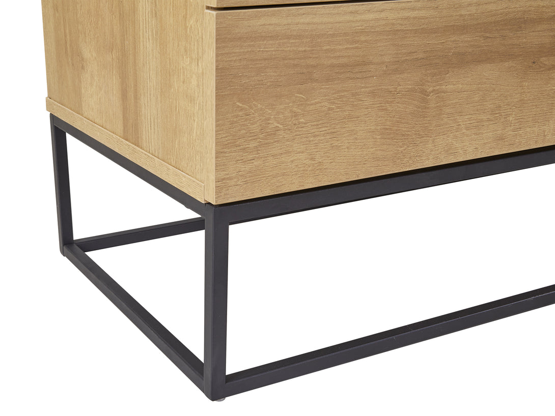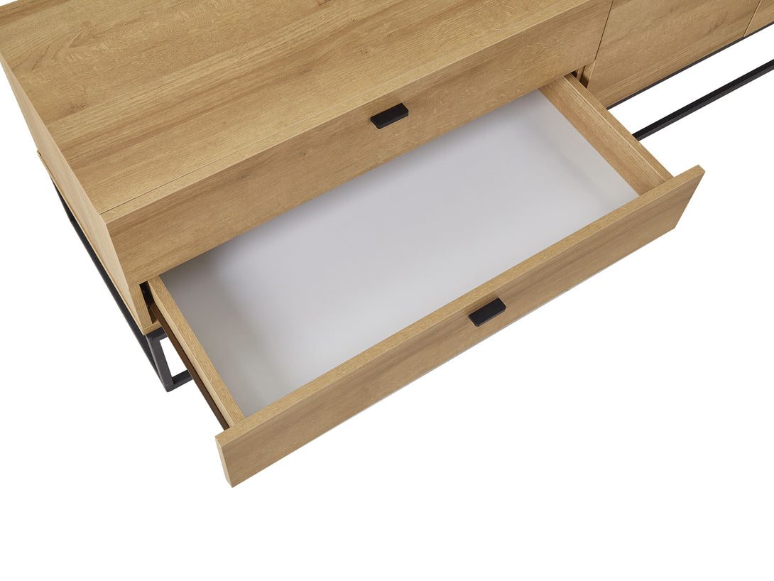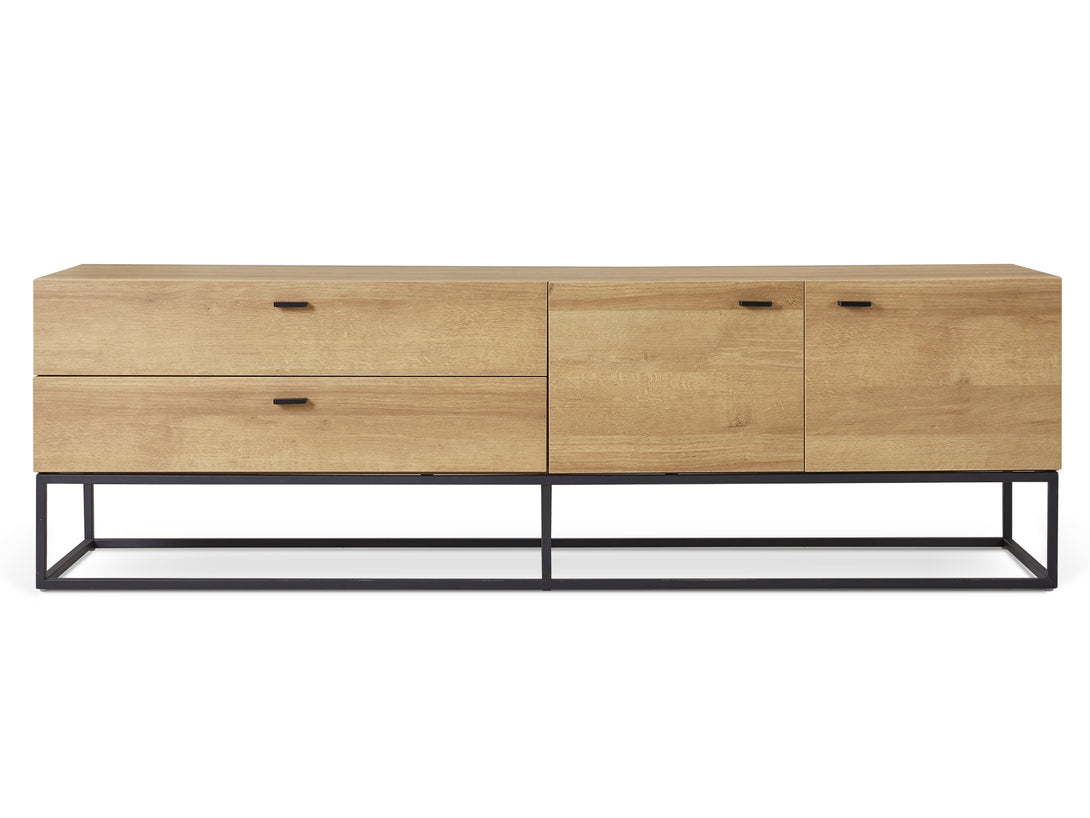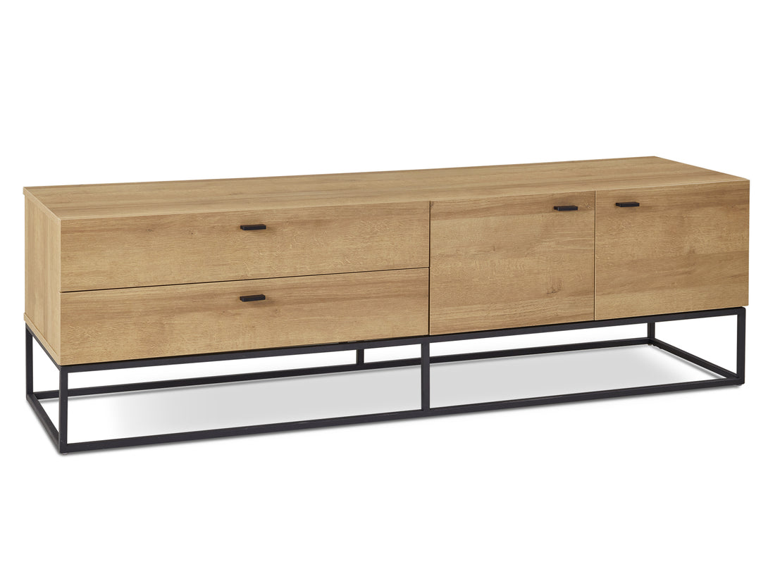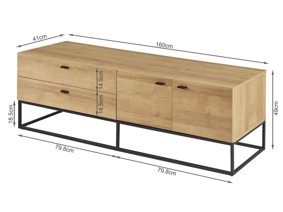 This XOAN Entertainment Unit is one of our XOAN range products which demonstrates delicate craftsmanship and has the perfect design to enhance your room. This entertainment unit is made of sturdy wood with metal frame which provides a strong foundation and substantial support to the whole construction; while the metal base gives it an industrial-inspired foundation; features a flat top for all kind of TV or media storage, also comes with 2 independent cabinets and 2 drawers allowing extra storage space for gaming consoles, headsets, DVDs and all sorts of accessories.